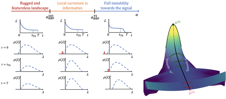 (Left) Phases of the gradient flow dynamics in the phase retrieval loss landscape for N going to infinity with a pictural representation of the Hessian eigenvalue distribution when varying the signal-to-noise ratio lpha. The red bar shows when an outlier exists in this distribution. (Right) Evolution of the local curvature: dynamics projected in the direction of least stability of the Hessian matrix (black arrows) in the intermediate (orange) regime of signal-to-noise ratio. Starting from an artless initial condition, gradient descent reaches a bad minimum. The green arrows indicate downward directions towards the good solution during the dynamics. At the end, the local curvature has become positive (red arrows).